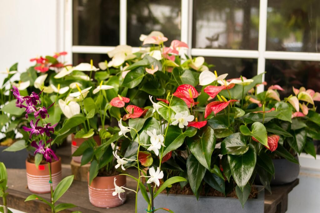 Para quem deseja um toque de cor sofisticado, o antúrio é uma escolha elegante. Suas flores duráveis valorizam varandas cobertas e iluminadas indiretamente.